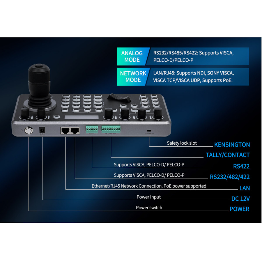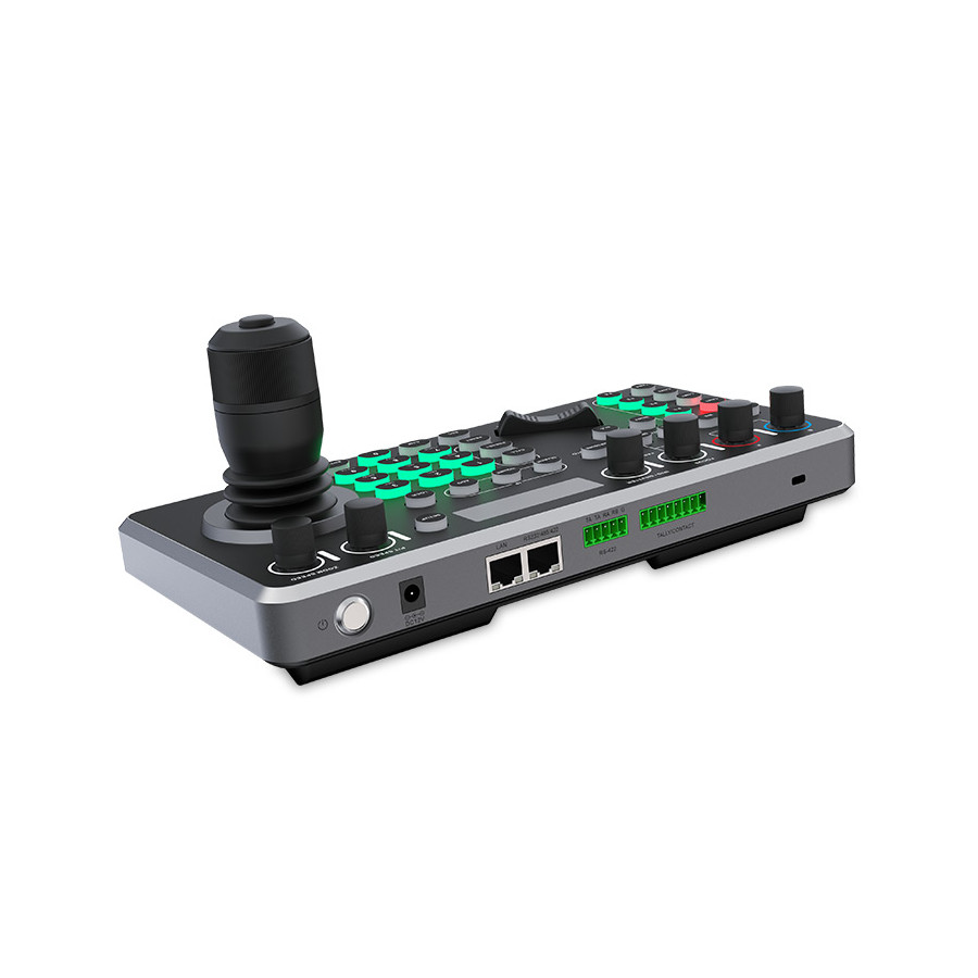 Urządzenie stworzone do użycia w transmisji na żywo, wideo konferencji, realizacji programów telewizyjnych. Może kontrolować do 255 kamer PTZ przez LAN lub połączenie szeregowe. Posiada wielofunkcyjny dżojstik i czytelnie opisane przyciski do szybkiej i precyzyjnej kontroli. Wyposażony jest w intuicyjny i elastyczny panel sterowania, umożliwiający łatwe przesuwanie, pochylanie, powiększanie, ustawianie ostrości, regulację przysłony, podświetlenia, ustawień wstępnych, prędkości PTZ oraz szybki wybór kamery PTZ w zależności od potrzeb. Na niewielkim wyświetlaczu LCD można podejrzeć aktualne statusy urządzeń. Obsługa szerokiej gamy protokołów i zasilanie PoE sprawiają, że ten kontroler PTZ bezproblemowo integruje się z różnymi kamerami.