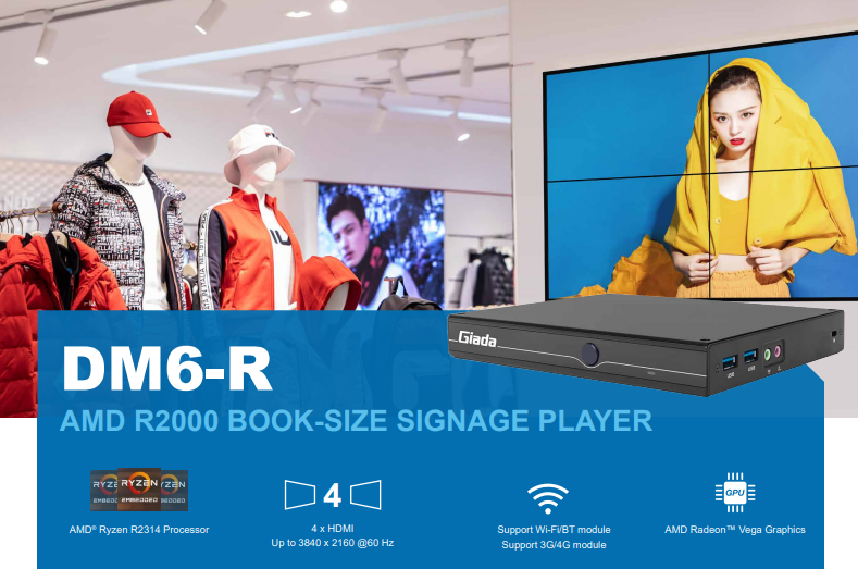 Giada DM6-R Mini PC AMD Ryzen™ R2000 Obsługa 4 wyjść HDMI® Digital Signage