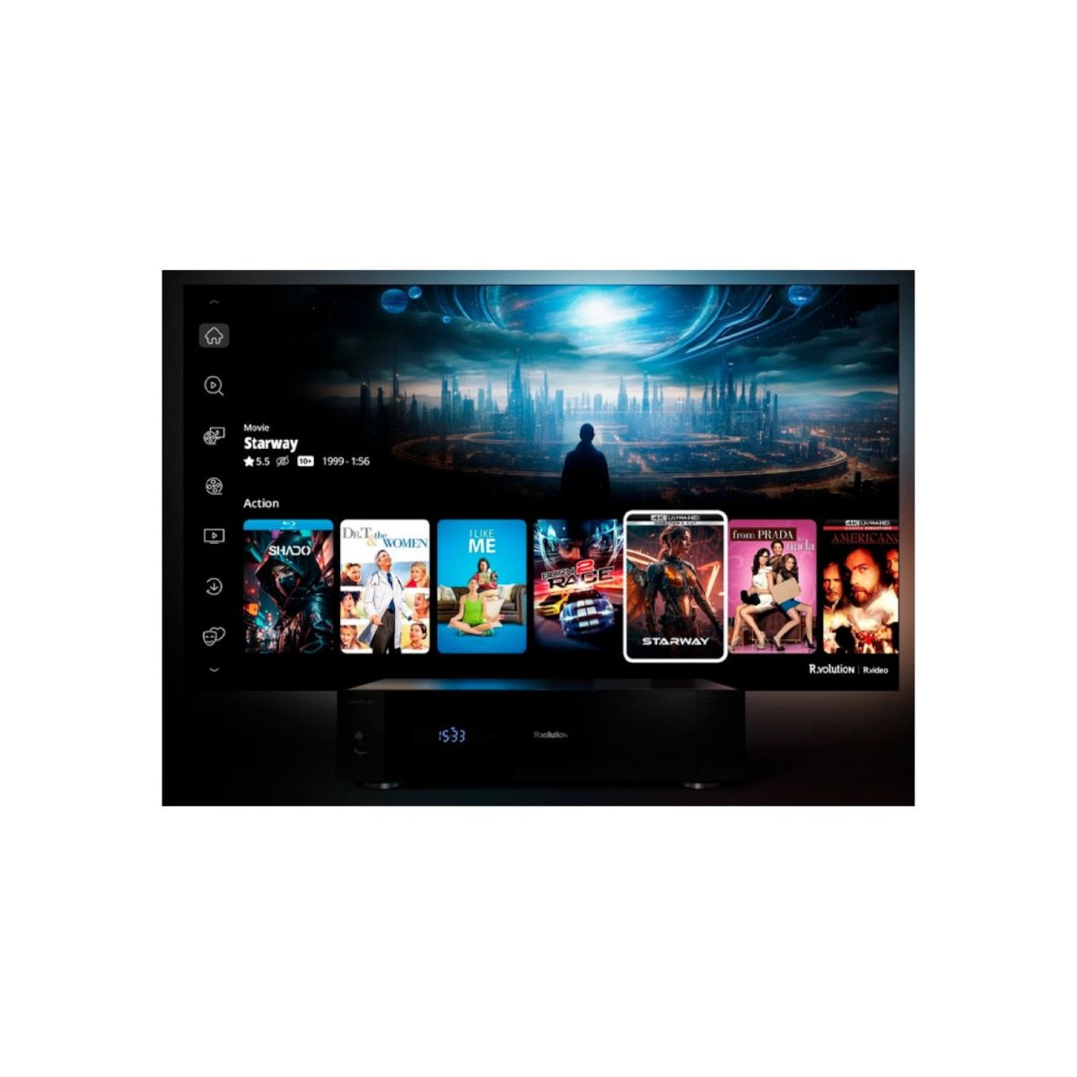 PlayerOne 8K zawiera bezpłatnie R_video — najlepsze centrum rozrywki dostępne na rynku, wyposażone w imponujący interfejs użytkownika umożliwiający przeglądanie filmów i programów telewizyjnych. R_video skanuje pliki wideo znajdujące się na dysku lokalnym podłączonym do odtwarzacza PlayerOne 8K lub na serwerze NAS za pośrednictwem sieci lokalnej. Następnie R_video zbiera okładkę, tło i różne informacje, takie jak obsada, reżyser, data premiery, ocena itp. Następnie będziesz musiał po prostu usiąść w swoim kinie domowym ze znajomymi lub rodziną i łatwo wybrać film lub program telewizyjny. Przeglądaj gatunek. Sortuj filmy według oceny, czasu trwania lub daty premiery. Przeczytaj streszczenie. Obejrzyj zwiastun. Następnie naciśnij przycisk PLAY, aby cieszyć się filmem. Po wyświetleniu napisów końcowych poczekaj na automatyczne uruchomienie kolejnego odcinka programu telewizyjnego. R_video jest dołączone do zakupu odtwarzacza. Nie ma potrzeby kupowania subskrypcji.