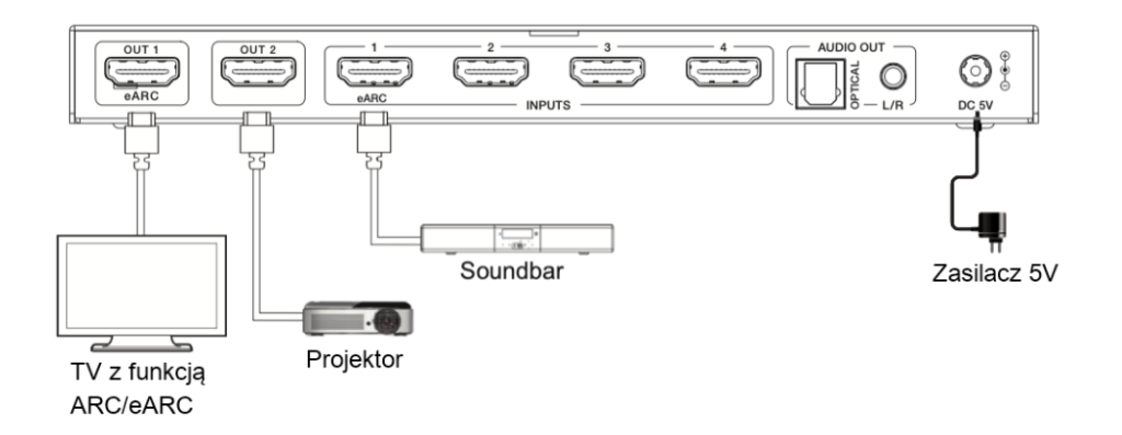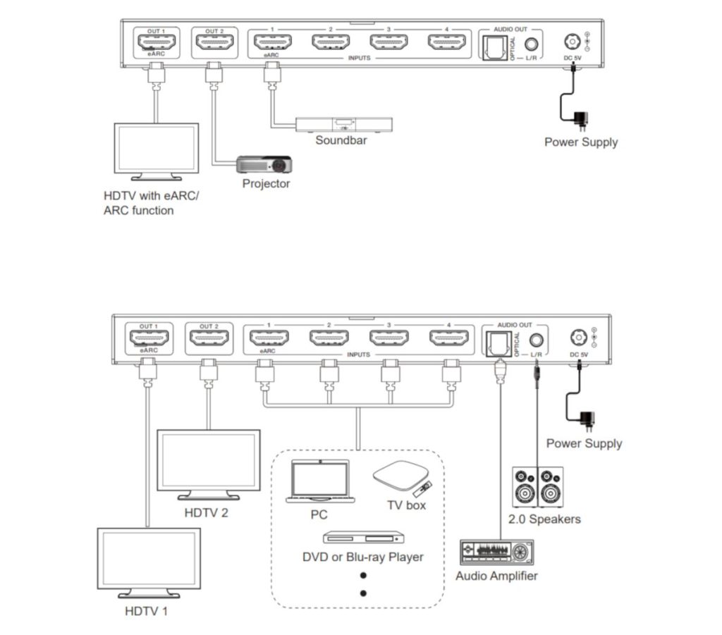 Wysokowydajny przełącznik matrycowy 8K HDMI 4×2 może dowolnie przełączać 4 sygnały wejściowe HDMI i dystrybuować je jednocześnie do 2 urządzeń wyświetlających. Przepustowość wideo wynosi do 40 Gb/s, a rozdzielczość wideo do 8K przy 60 Hz 4:2:0. Obsługuje zwrot dźwięku eARC (tylko dla portów INPUT 1 i OUT 1) oraz funkcję usuwania dźwięku. Dzięki temu umożliwia podłączenie głośników zintegrowanych typu soundbar (m.in. SONOS).
